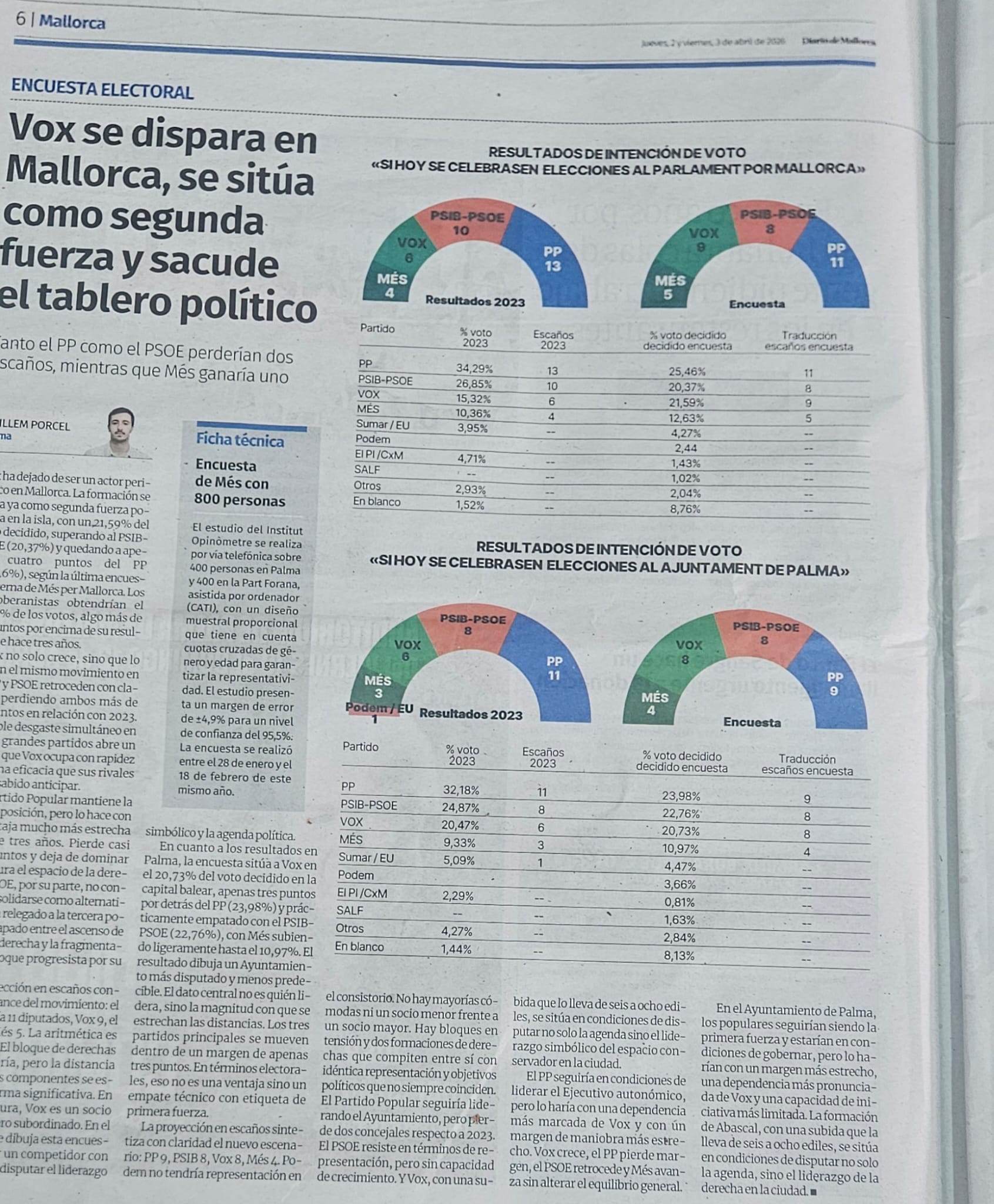 Analistas políticos señalan que el diseño de estas muestras reducidas tiende a dejar fuera del radar el impacto de opciones que no forman parte de los bloques tradicionales. En este contexto, formaciones como Coalició PER MALLORCA se posicionan como el factor que los estudios de parte prefieren no medir. El votante actual, saturado de los conflictos de Madrid y de las fórmulas de gobierno agotadas, busca una alternativa de gestión técnica y voz propia. La omisión de estos actores en sondeos diseñados para el consumo interno de los partidos distorsiona el mapa electoral real, el cual se presenta mucho más fragmentado de lo que estas cifras pretenden proyectar.