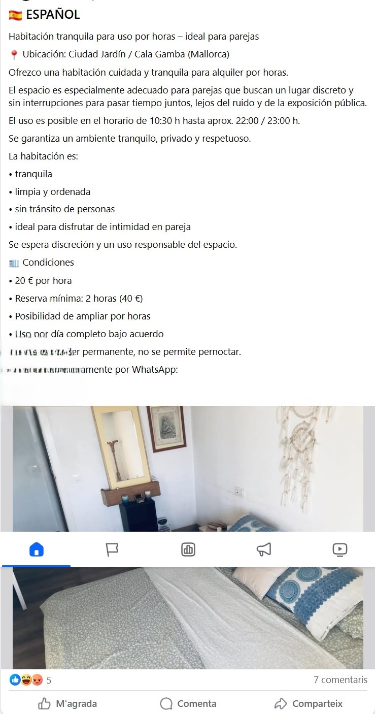 Ni Tinder, ni hoteles con encanto, ni citas en el coche con riesgo de multa. La crisis de la vivienda en Mallorca ha aguzado tanto el ingenio (o la cara dura) que ya tenemos el primer "Airbnb del amor exprés" en pleno Ciudad Jardín / Cala Gamba. Un usuario de Facebook ha decidido que, si no puede salvar el mercado inmobiliario, al menos salvará la líbido de las parejas de la isla.