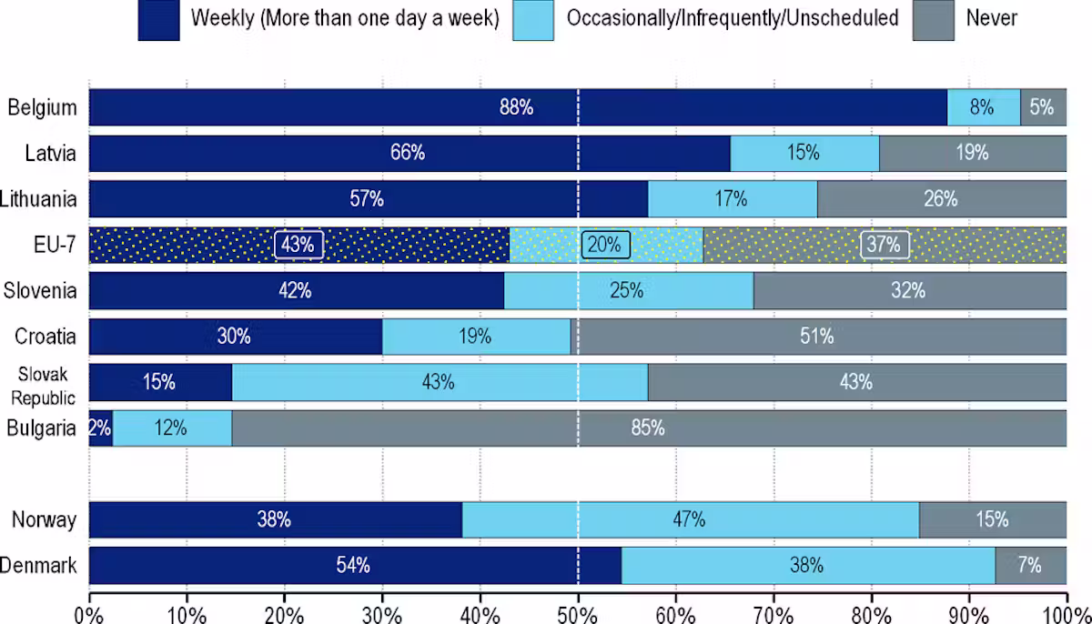 Les institucions a tots els nivells podrien anar més enllà de les bones intencions i començar a practicar allò que prediquen. Segons l’enquesta de l’OCDE i la UE de 2024 sobre els funcionaris públics, aproximadament dos de cada cinc (37,2 %) mai treballen a distància, mentre que només un de cada cinc (22,6 %) ho fa entre un i dos dies a la setmana.